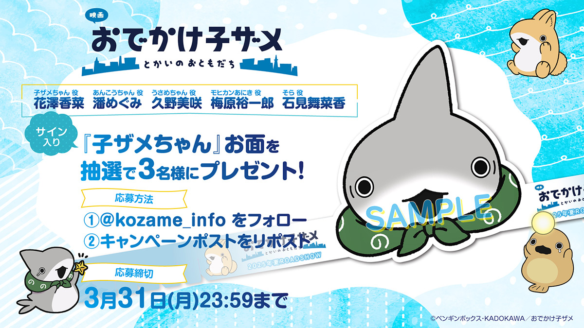 花澤香菜さん(子ザメちゃん役) 、潘めぐみさん(あんこうちゃん役)、 久野美咲さん(うさめちゃん役)、 梅原裕一郎さん(モヒカンあにき役)、 石見舞菜香さん(そら役)のサイン入り『子ザメちゃん』お面が抽選で3名様に当たるプレゼントキャンペーンが公式Xにて実施いたします。