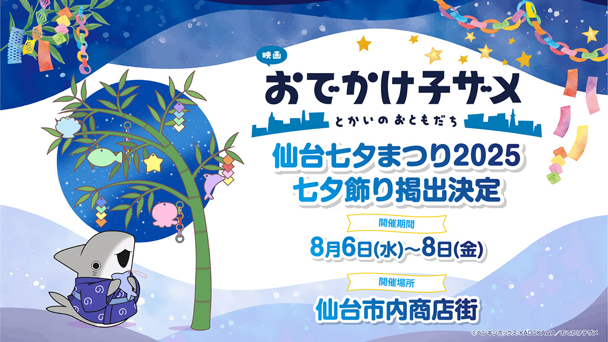 2025年8月6日(水)より仙台市にて開催される『仙台七夕まつり2025』の一環として、仙台市内の商店街にて秋田県『映画 おでかけ子ザメ とかいのおともだち』のオリジナル七夕飾りが掲出されることが決定!さらに会場ではペンギンボックス先生描き下ろしの『ご当地子ザメちゃん』北海道・東北ビジュアル使用グッズも販売に先んじて会場にて先行販売いたします!北海道・東北ならではの風景や文化とコラボした、かわいい子ザメちゃんの限定イラストが楽しめるアイテムばかりですので、ぜひこの機会にお立ち寄りください!