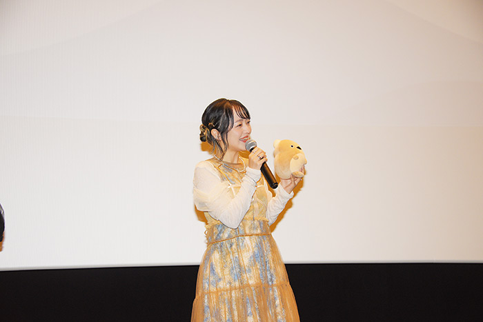 会場の盛り上がりを受けて、映画のおすすめポイントを聞かれると、花澤は悩みながらも「モヒカンあにきに抱っこされていっしょに映画を観て、感動してえぐえぐしてるところ」を挙げ、続いて「あんこうちゃんが子ザメちゃんのように自分がもらったものを人にあげるシーンがあったんですよ。出会ったばかりのホストのお兄さんにおにぎりをあげるシーンですかね。分け与えるやさしさが良かったです!」(潘)、「子ザメちゃん、あんこうちゃん、うさめちゃん以外の動物のキャラクターたちの鳴き声・喋り方もキャストの皆さん工夫していたので、そこもぜひ見てほしいです!」(久野)とそれぞれ語ってくれた。
