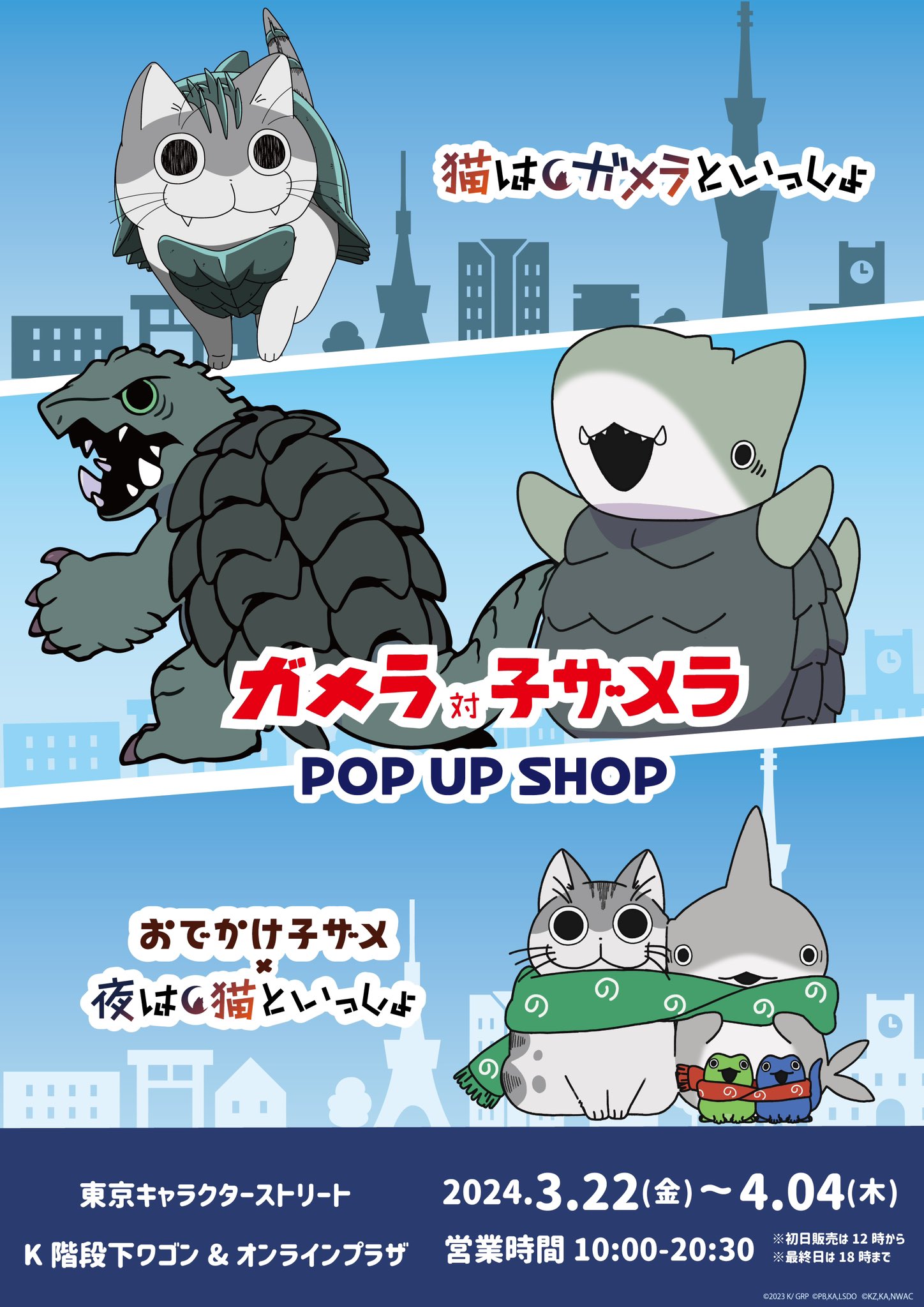 東京ストリートにて本日より、「おでかけ子ザメ」「夜は猫といっしょ」「GAMERA -Rebirth-」3コラボのPOP UP SHOP開催!